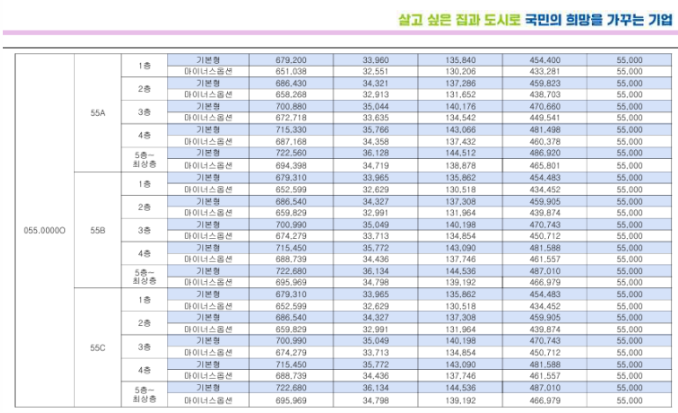 분양가는 전용 46㎡가 약 5억 4,600만~6억 500만 원, 전용 55㎡가 약 6억 5,100만~7억 2,200만 원입니다. 마이너스옵션 선택 시 분양가를 2,000만 원가량 낮출 수 있습니다.