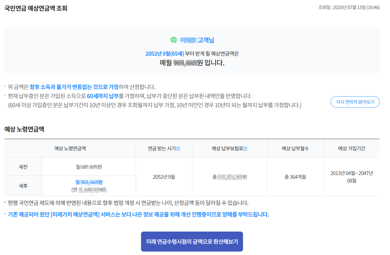 현재 소득 기준과 가입기간을 바탕으로 한 예측치입니다.