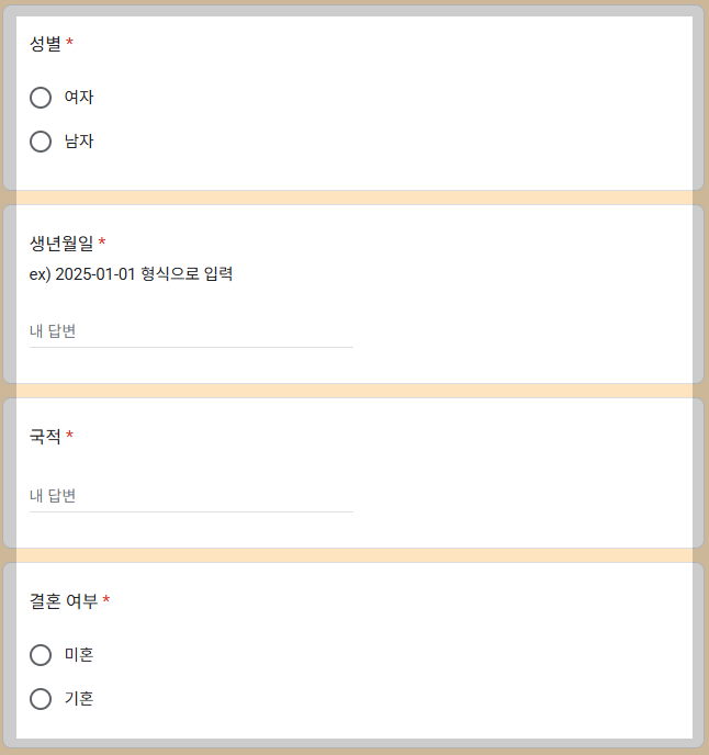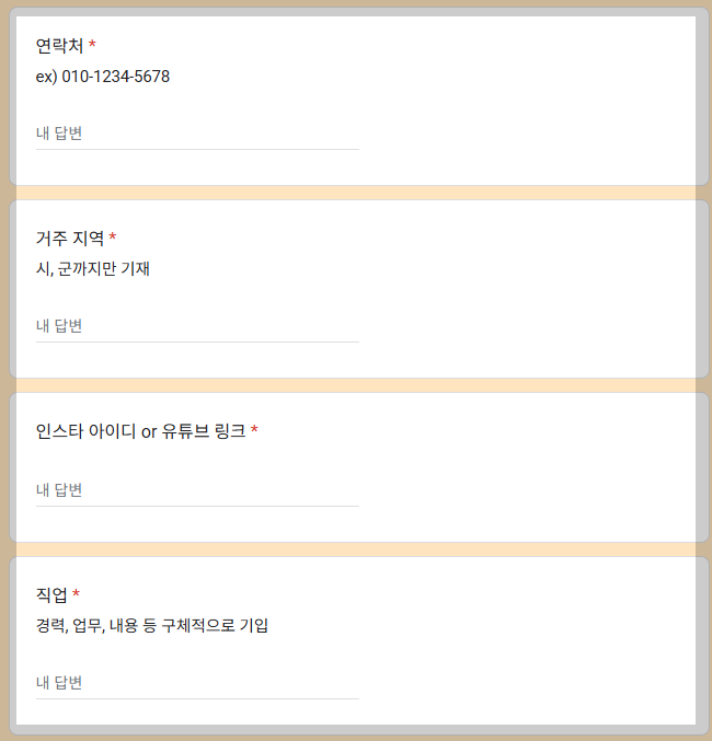 - 인적사항: 이름, 성별, 생년월일, 국적, 연락처, 지역, SNS 링크 등