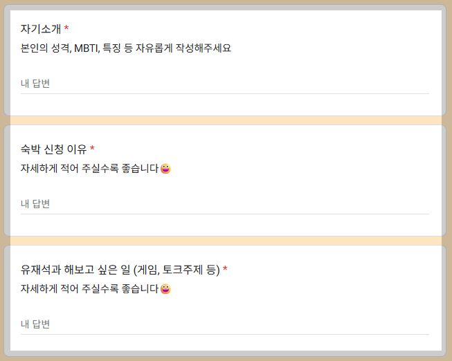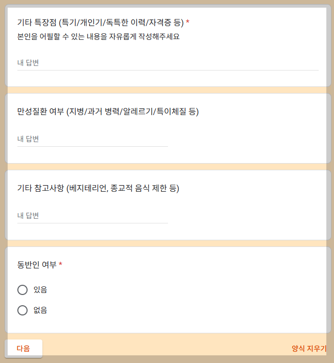 - 필수 작성 항목: 자기소개, 활동 희망사항, 동반인 여부 등