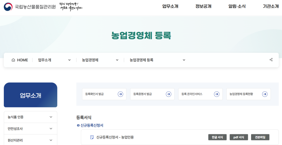 - 농업경영체 등록신청서 (농관원 사무소 또는 정부24에서 작성 가능)
