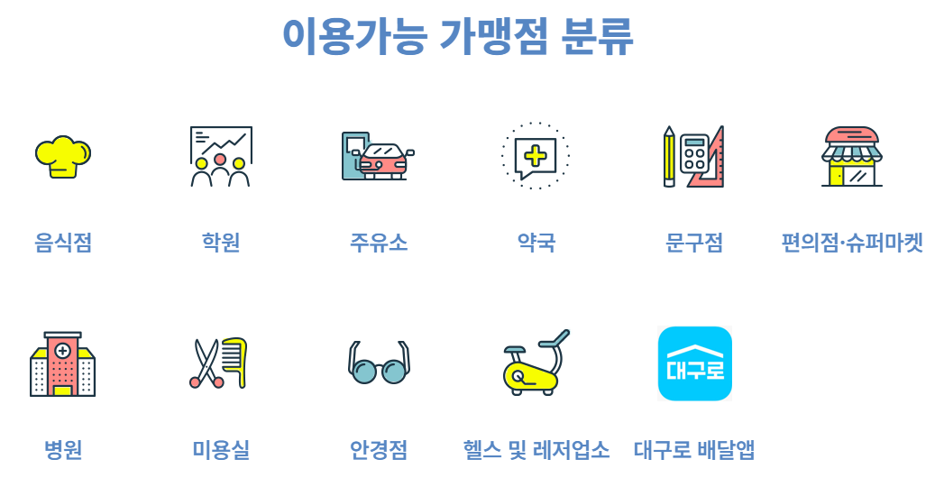 즉, 동네 음식점, 카페, 학원, 병원, 생활편의점 등에서 폭넓게 사용 가능하다는 점이 장점입니다.