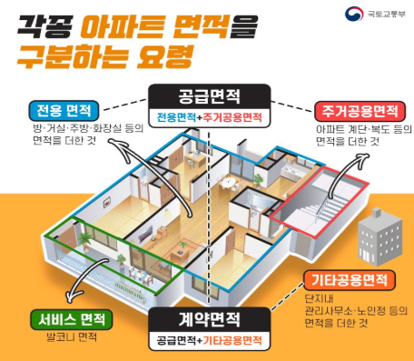 - 전용면적: 내가 실제로 사용하는 공간 (방, 거실, 욕실, 주방 등)