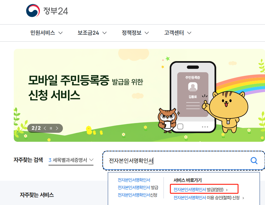 - 정부24 접속 및 로그인 → 전자본인서명확인서 발급 → 사용 용도 선택 후 발급