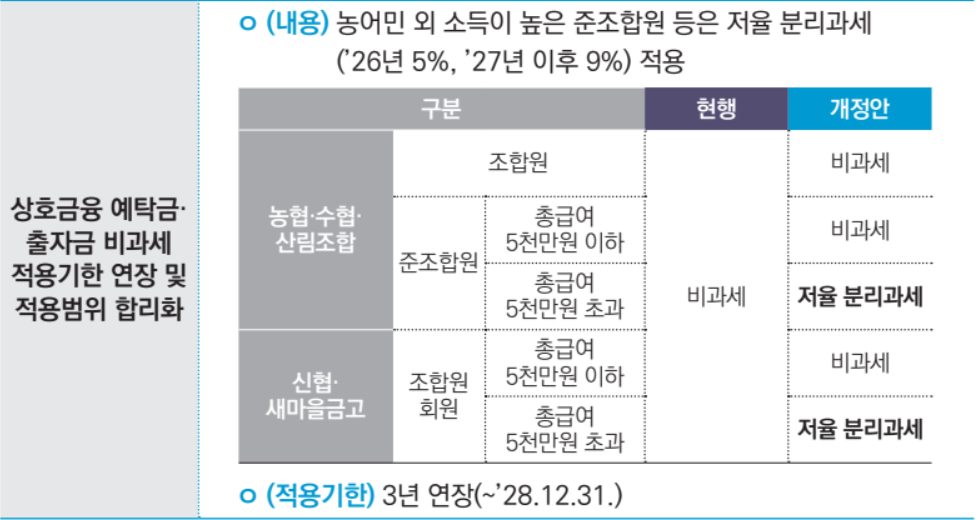 정부는 이러한 상황이 제도의 본래 취지에서 벗어났다고 판단하고 있으며, 이에 따라 준조합원 중 고소득자에 한해 분리과세로 전환하게 되었습니다. 한편, 일반 금융기관과의 공정한 경쟁을 위한 세제 정비라는 점도 이번 개편안에 반영되었습니다.