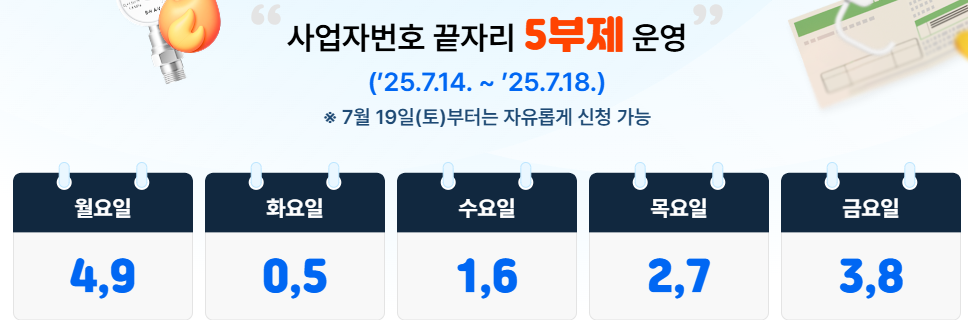 신청 첫 주(7.14 ~ 7.18)에는 사업자등록번호 끝자리를 기준으로 5부제 신청만 가능합니다.