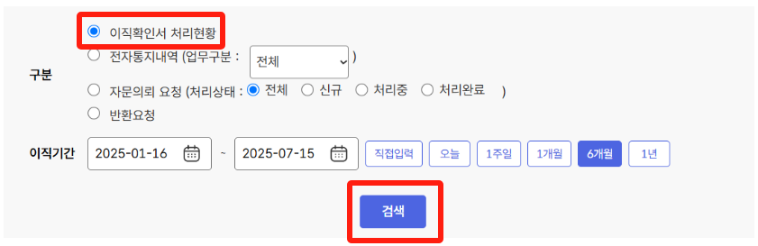 이직확인서 제출 여부와 처리 상태를 확인할 수 있어요.