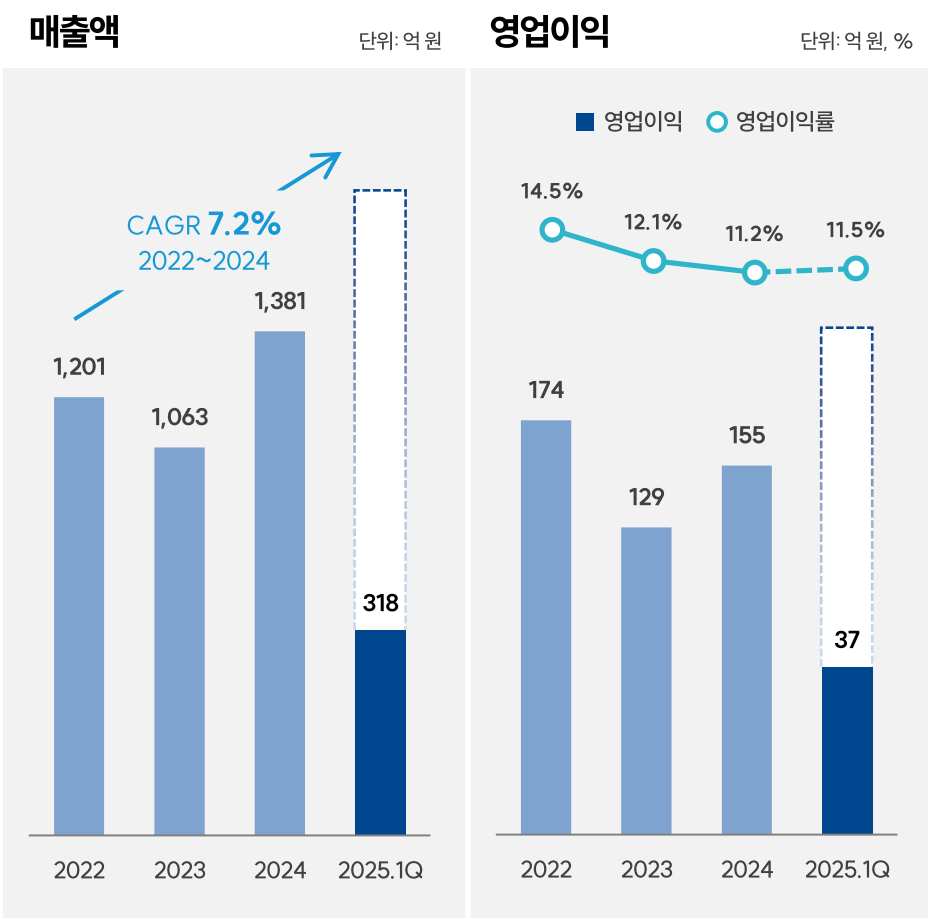 2024년 기준 매출액은 약 1,381억 원, 영업이익은 180억 원, 순이익은 227억 원을 기록하며, 안정적인 실적 성장을 지속하고 있습니다. 상장은 기술특례 방식이 아닌 실적 기반 일반공모 방식으로 진행되며, 이는 기업의 내실이 검증되었음을 의미합니다.