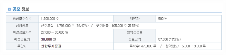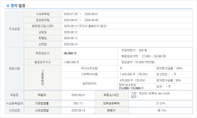총 공모주식 수는 190만 주이며, 이 중 약 94.5%에 해당하는 1,795,000주는 신주 모집, 나머지 105,000주는 구주 매출로 구성됩니다. 확정 공모가 30,000원을 기준으로 총 공모금액은 약 570억 원에 이릅니다. 기관투자자에게 75%, 일반 청약자에게 25%가 배정되며, 일반 투자자 대상 청약은 신한투자증권 단독으로 8월 7일부터 8월 8일까지 이틀간 진행됩니다.