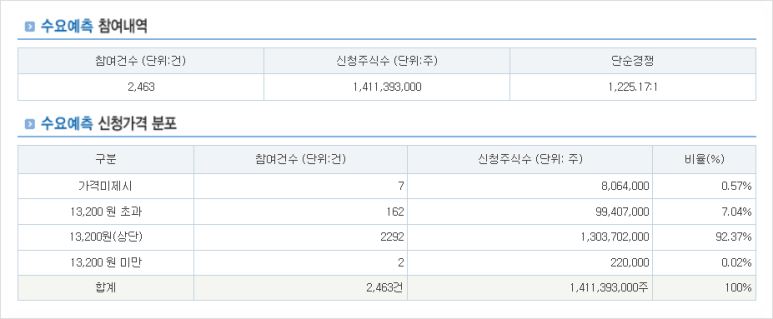 2025년 7월 말부터 8월 초까지 진행된 수요예측에 2,463개 기관이 참여했고, 총 1,225.17:1의 경쟁률을 기록했습니다. 기관의 약 92%가 공모가인 13,200원에 주문을 했고, 초과 가격 주문도 7% 이상이었습니다.
