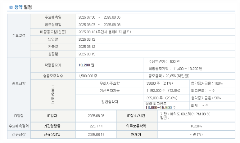 청약은 2025년 8월 7~8일, 대신증권 단독으로 진행되며, 상장일은 8월 19일로 예정되어 있습니다. 공모 구조와 유통 물량, 수요예측 결과 등을 종합적으로 검토한 뒤 투자 결정을 하시기 바랍니다.