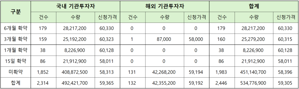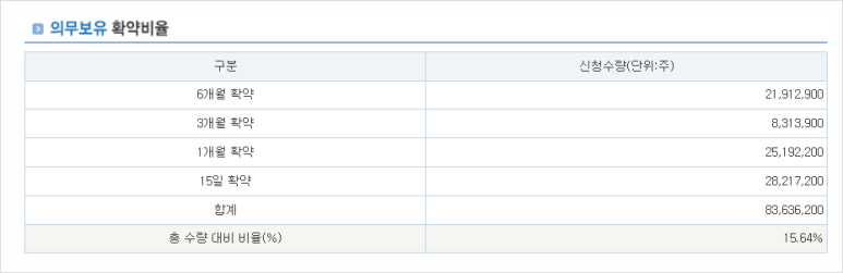 확약 기간은 15일부터 최대 6개월까지 다양하게 분포되어 있으며, 특히 1개월 이상 확약된 물량이 67% 이상을 차지해 상장 직후 주가 안정성에 긍정적인 요소로 작용할 가능성이 있습니다.