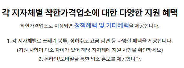 착한가격업소로 지정되면 단순히 홍보 효과뿐만 아니라 다양한 행정 지원도 받을 수 있습니다. 지자체별로 전기요금 감면, 쓰레기봉투 지원, 홍보 간판 설치 지원 등의 혜택이 제공되며, 고객 유입이 증가하는 경향도 확인되고 있습니다.