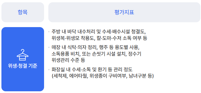 - 위생 청결: 매장, 주방, 화장실 등 전반적인 청결 상태가 우수해야 합니다.