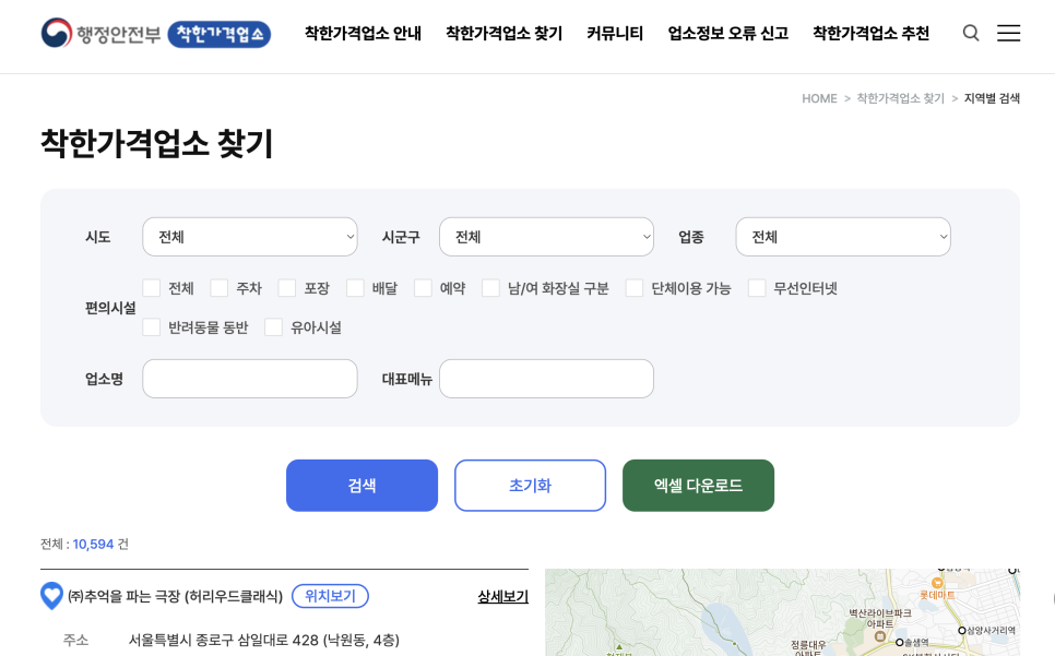 가장 빠른 방법은 행정안전부 착한가격업소 누리집을 활용하는 것입니다. 시도-시군구-업종을 선택하면 원하는 지역의 착한가격업소 목록을 상세히 확인할 수 있습니다. 업소별 대표메뉴, 주소, 가격, 편의시설 등도 함께 제공되어 사용자 편의성이 높습니다.