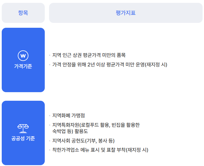 - 공공성: 지역화폐 가맹, 로컬푸드 활용, 사회공헌 활동 여부도 평가 항목에 포함됩니다.